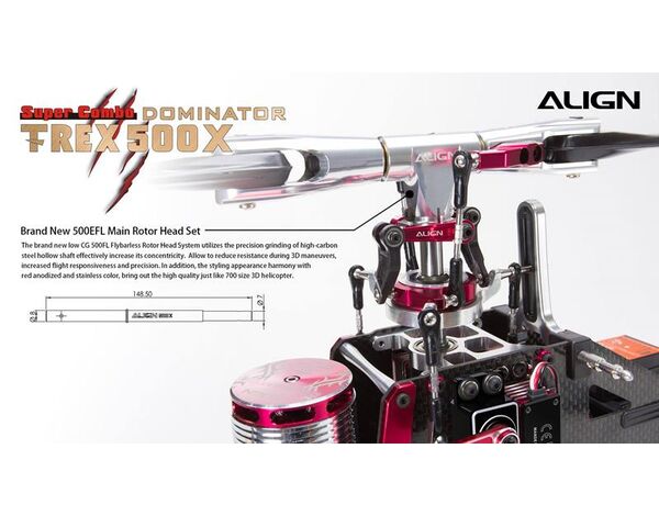 Der T-REX 500X Dominator kommt mit dem Microbeast PLUS Flybarless System daher. Als Rotorkopf kommt hier der neue Flybarless-Rotorkopf mit Taumelscheibenmitnehmer und rot eloxierten Aluminiumteilen zum Einsatz.
