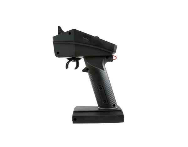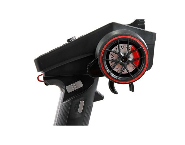 Die Steuerung bietet folgende Bedienelemente: Gas, Lenkung, einen Drucktaster am Griff (SWB), einen Drei-Wege-Schalter über dem Griff (SWA) und zwei einfache Taster auf der Oberseite. Digitale Trimmung sorgt dafür, dass alle Einstellungen erhalten bleiben, auch wenn die Fernbedienung ausgeschaltet wird.