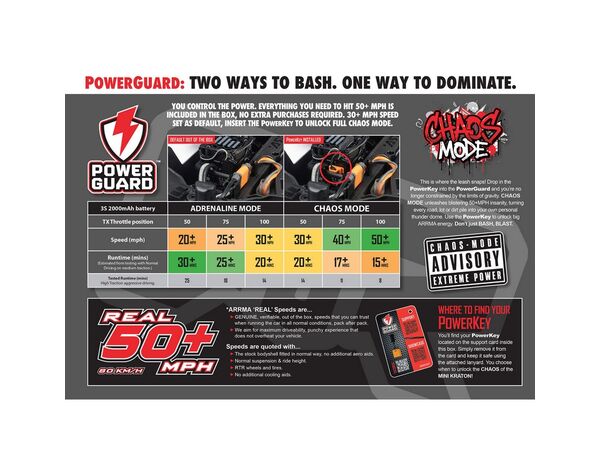 Und dann ist da noch die Power, die alles verändert. Der MINI KRATON 3S BLX ist das erste ARRMA-Fahrzeug mit PowerGuard. Direkt aus der Box erreicht er auf 3S beeindruckende 45+ km/h und bietet über 20 Minuten Fahrzeit. Perfekt, um deine Skills zu verbessern und gleichzeitig die volle Brushless-Power zu spüren. Ist dir das zu viel? Ein Schalter genügt, und du kannst über 30 Minuten Fahrzeit genießen. Wenn dein Selbstvertrauen wächst und dein Grinsen breiter wird, ist es Zeit für den PowerKey. Stecke ihn ein und entfessle die volle 80+ km/h 3S-Power, die dieses kompakte Kraftpaket in einen echten KRATON verwandelt.