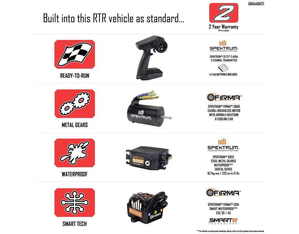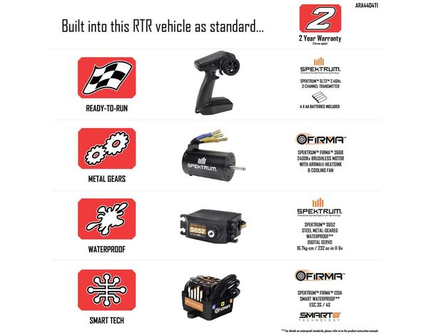 Dank des werkseitig installierten Brushless Spektrum Firma™ 2400Kv-Motors und des wasserdichten Firma 120A-Reglers mit IC5®-Anschlüssen steht dir eine unglaubliche Beschleunigung zur Verfügung. Das robuste Verbundwerkstoff-Chassis und das EXB (EXtreme Bash) Getriebe meistern alles. Der MOJAVE Desert Truck führt außerdem ein robustes Mitteldifferential mit der ARRMA 4S BLX 4X4-Plattform ein, das für wirklich fantastische Traktion und geniales Handling sorgt.