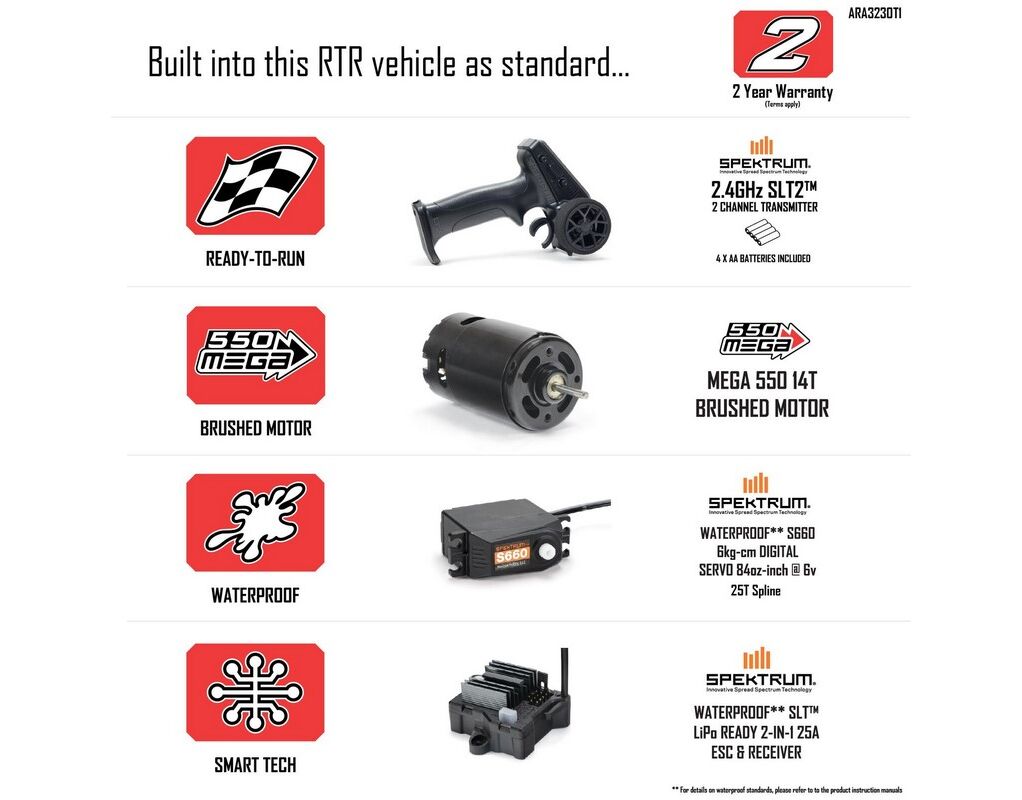 Wenn du RC-Neuling bist, hilft dir die Spektrum™ SLT2 2-Kanal-Fernsteuerung beim sicheren Erlernen der Fahrfunktionen, indem du die Höchstgeschwindigkeit auf 50 % oder 75 % begrenzt, bis du bereit bist, die volle Power zu entfesseln. Bashe unbesorgt unter nassen Bedingungen – die Spektrum 2-in-1 25A-Regler-/Empfängereinheit und das drehmomentstarke Spektrum S660-Lenkservo sind beide wasserdicht (Einzelheiten findest du in der ARRMA GORGON MT-Bedienungsanleitung).