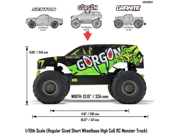 Bashe jenseits normalen RC Modellautos mit einem Monstertruck, wie nur ARRMA® ihn erschaffen kann – Beinhart, voller Charakter und in der Lage alles was seinen Weg kreuzt zu schlagen. Der vollständig montierte und fahrbereite 1/10 ARRMA GORGON™ MT ist selbst für junge Basher-Neulinge perfekt geeignet oder bietet eine unterhaltsame Ergänzung für den Fuhrpark jedes erfahrenen Bashers. Es macht Spaß, ihn zu fahren, er ist erschwinglich in der Anschaffung und lässt sich einfach mit LiPo-Akku und Brushless Motor aufrüsten, wann immer du dich für die nächste Leistungsstufe bereit fühlst.