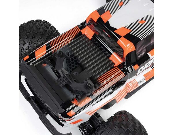Das robuste Chassis ist belüftet, um die integrierten Komponenten kühl zu halten, und größere Side-Guards bieten maximalen Schutz vor Schmutz und Sand. Die integrierte, monochrome Elektronik sorgt für eine ansprechende Optik, und die Akkugurte lassen sich für einen 2S-Hardcase-LiPo-Akku Deiner Wahl anpassen.