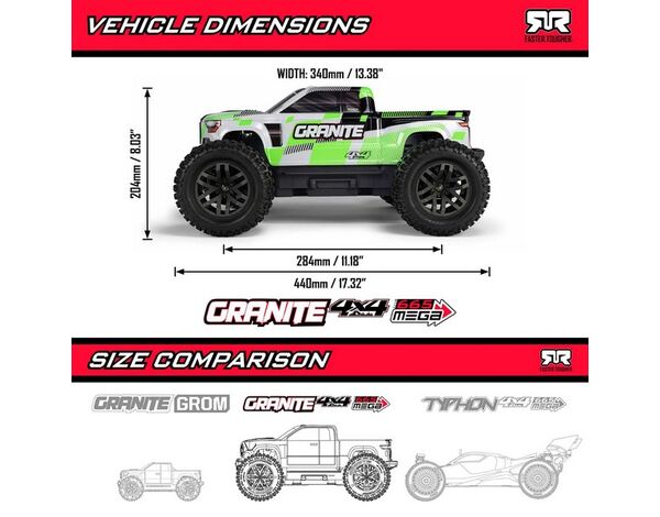 Mit dem 1/10 ARRMA GRANITE MEGA 665 erlebst du unschlagbaren Allrad-Grip. Der ready-to-run Brushed-Monstertruck bietet enorme Power und Robustheit direkt out-of-the-Box, und wenn du später noch mehr Leistung möchtest, kannst du ihn ganz einfach auf ein Brushless-Antriebssystem upgraden.