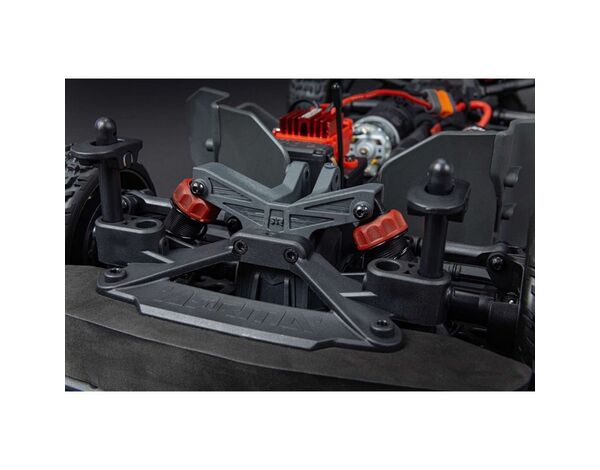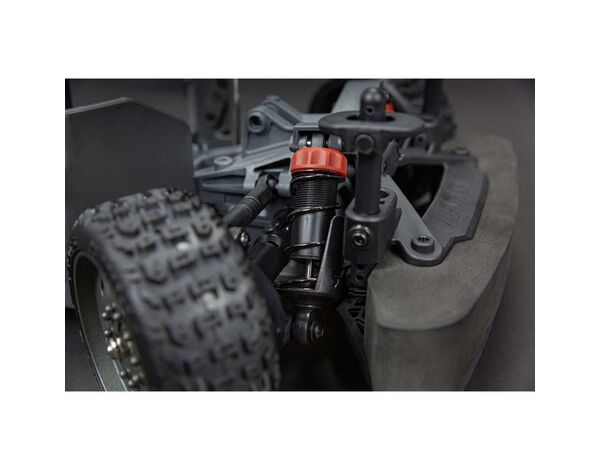 Die ölgefüllten Stoßdämpfer verfügen über Silikon-O-Ringe und sind mit Gewinde versehen, um eine einfache Einstellung der Fahrhöhe zu ermöglichen. In Kombination mit der vorderen und hinteren Doppelquerlenker-Aufhängung, den vorderen und hinteren Stabilisatoren und dem großen Heckdiffusor verleihen sie dem INFRACTION ™ 4X4 Mega Street Bash Resto-Mod Truck RTR das ultimative Allroad-Handling.