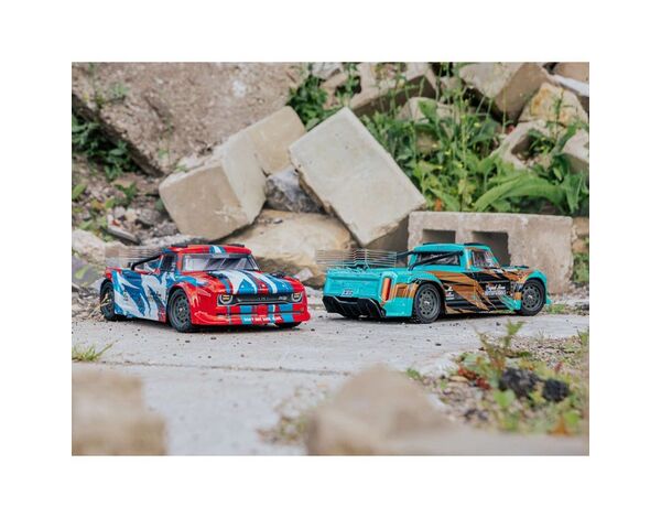 Abgerundet wird das fahrbereite Chassis durch eine atemberaubende Truck-Karosserie, die in Rot/Blau oder Türkis/Bronze bedruckt ist. Roof Skids und Überrollbügel bewahren das markante Finish der Karosserie, während du mit Allroad-Bashing beschäftigt bist. Der ARRMA® INFRACTION™ 4X4 MEGA Street Bash Resto-Mod Truck wird komplett mit einem Dynamite® 7-Zellen 8,4V NiMH-Akku und einem Steckdosenladegerät geliefert. Setze nur einfach vier „AA"-Batterien in die Fernsteuerung ein und los geht's!