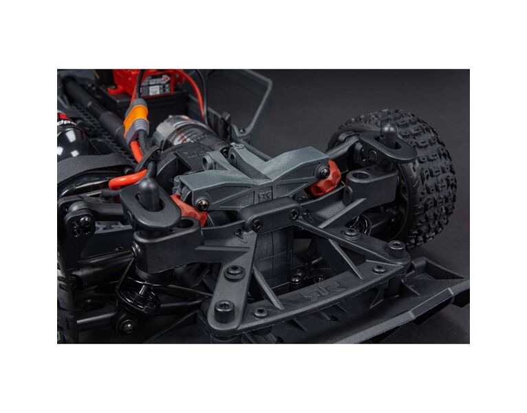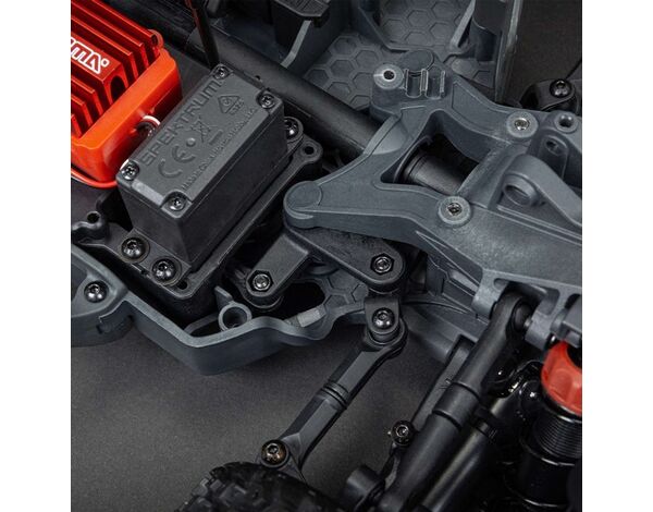 Für eine präzise und zuverlässige Kontrolle haben die ARRMA®-Ingenieure dieses RTR Set mit der 2,4-GHz-Spektrum™ SLT3™-Fernsteuerung und dem SLR300-Empfänger ausgestattet. Der Sender ist ergonomisch für langes ermüdungsfreies Bashing ausgelegt und verfügt über ein Schaumstoffrad um präzises Fingerspitzengefühl zu ermöglichen und einen verbesserten Griff und Gashebel für bessere Gaskontrolle. Neue Fahrer können Gaslimits auf 50 % oder 75 % einstellen, bis sie bereit sind, das volle Geschwindigkeitspotenzial auszuschöpfen. Die SLT3™ ist mit Tactic® SLT™-Empfängern kompatibel, um auch andere RTR-Fahrzeuge betreiben zu können, die du möglicherweise besitzt. Darüber hinaus verfügt sie über einen dritten Kanal zur Steuerung optionaler Funktionen wie Beleuchtung oder Winden bei anderen Fahrzeugen, die über diese Funktionen verfügen.