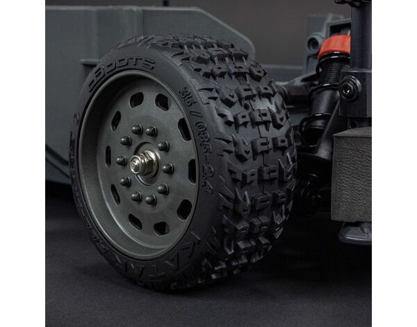 Der INFRACTION™ 4X4 MEGA Street Bash Resto-Mod Truck ist mit einem leistungsstarken MEGA 9T Brushed 570 Motor und einem für Brushlessmotoren vorbereitetem Getriebe ausgestattet. Mit einem optionalen Ritzel (nicht im Lieferumfang enthalten) kann er unter optimalen Bedingungen Geschwindigkeiten von mehr als 48 km/h erreichen. Die dBoots® Katar Allroad-Reifen sind aus hochwertigem Gummi für lange Haltbarkeit geschaffen und bieten unglaubliche Traktion auf allen Untergründen. Die Reifen sind auf robuste, metallfarben lackierte Nylonräder geklebt und verfügen über hochwertige Einlagen für eine hervorragende Profilunterstützung.