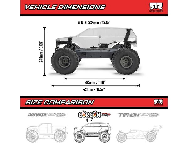 Erlebe noch mehr Spaß mit deinem ersten – oder nächsten – RC-Basher, indem du ihn selbst aus dem 1/10 ARRMA® GORGON™ MT 2WD RTA-Bausatz (Ready-to-Assemble) aufbaust! Befolge einfach die Schritt-für-Schritt-Anleitung, um die werkseitig gefertigten Module, die vormontierten Räder und die vollständig fertiggestellte Karosserie zu einem atemberaubenden RC-Monstertruck zusammenzubauen, der super robust, voller Charakter und in etwa einer Stunde bereit zum Bashen ist. Es ist auch ein tolles Familienprojekt und eine spannende Möglichkeit für Kinder, handwerkliches Geschick zu erlernen, das auf viele andere Hobbyprojekte angewendet werden kann.