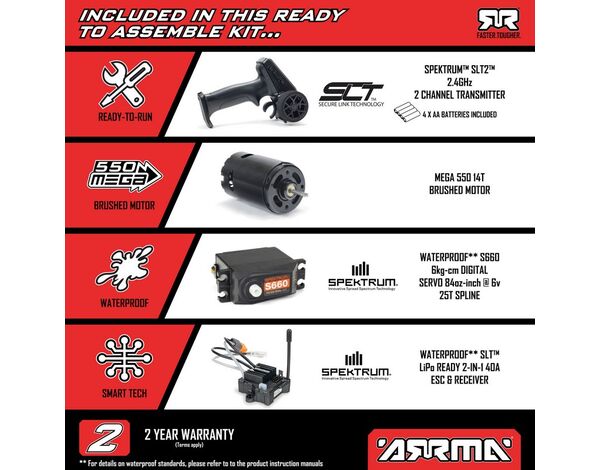 Wenn du RC-Neuling bist, hilft dir die Spektrum™ SLT2 2-Kanal-Fernsteuerung beim sicheren Erlernen der Fahrfunktionen, indem du die Höchstgeschwindigkeit auf 50 % oder 75 % begrenzt, bis du bereit bist, die volle Power zu entfesseln. Bashe unbesorgt unter nassen Bedingungen – die Spektrum 2-in-1 25A-Regler-/Empfängereinheit und das drehmomentstarke Spektrum S660-Lenkservo sind beide wasserdicht (Einzelheiten findest du in der ARRMA GORGON MT-Bedienungsanleitung).