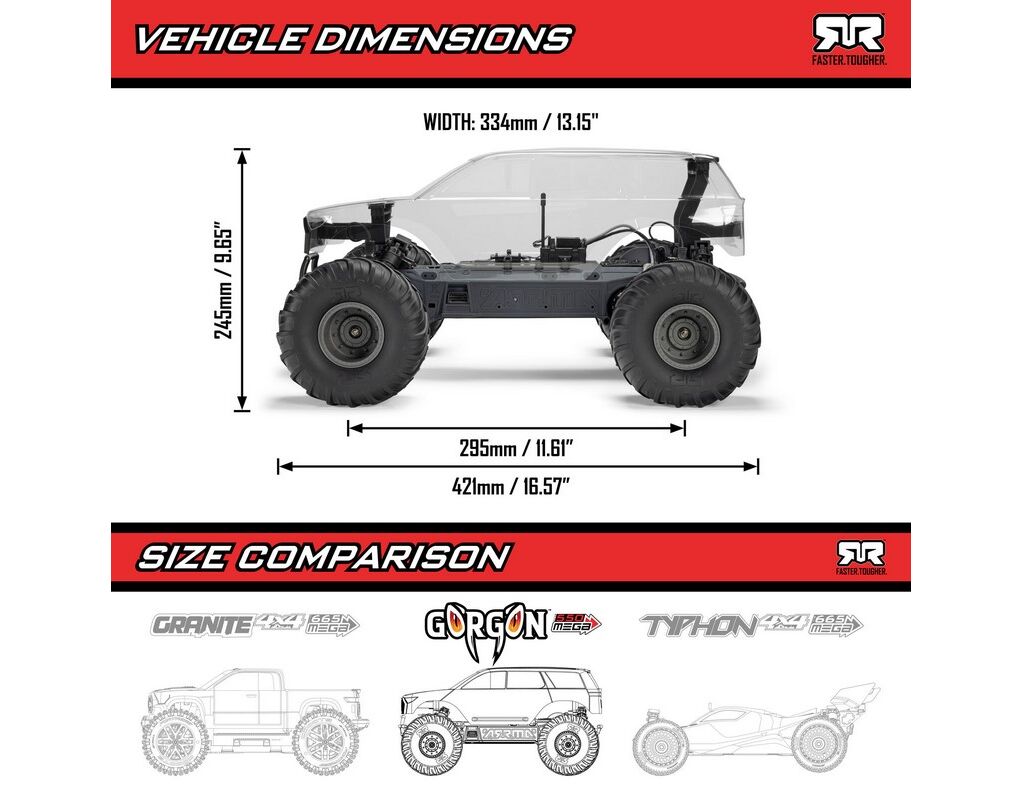 Erlebe noch mehr Spaß mit deinem ersten – oder nächsten – RC-Basher, indem du ihn selbst aus dem 1/10 ARRMA® GORGON™ MT 2WD RTA-Bausatz (Ready-to-Assemble) aufbaust! Befolge einfach die Schritt-für-Schritt-Anleitung, um die werkseitig gefertigten Module, die vormontierten Räder und die vollständig fertiggestellte Karosserie zu einem atemberaubenden RC-Monstertruck zusammenzubauen, der super robust, voller Charakter und in etwa einer Stunde bereit zum Bashen ist. Es ist auch ein tolles Familienprojekt und eine spannende Möglichkeit für Kinder, handwerkliches Geschick zu erlernen, das auf viele andere Hobbyprojekte angewendet werden kann.