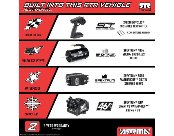 Mit seinem 6S-fähigen brushless Spektrum System erreichst du mit dem KRATON 6S BLX 4X4 unglaubliche Geschwindigkeiten von über 105kmh. Zu den Komponenten gehören ein Firma 150A Smart V2 ESC mit neuer, leistungsstärkerer Firmware, ein Firma 2050Kv brushless Motor und ein zuverlässiges S665 Lenkservo mit Stahlgetriebe. Die Elektronik ist wasserdicht, sodass du unter allen Bedingungen – sogar bei Schlamm oder Schnee – ohne Bedenken losbashen kannst.