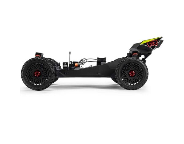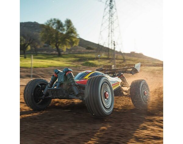 Die Karosserie des TYPHON MEGA 665 4x4 Racing Buggys wird durch ein verstecktes, Clipless-Befestigungssystem sicher an ihrem Platz gehalten. Die Karosserie ist in verschiedenen kräftigen, werkseitig lackierten Farben erhältlich und verfügt über einen High-Downforce-Flügel.