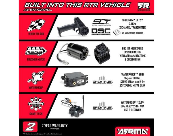 Hochwertige, wasserdichte Spektrum-Elektronik ermöglicht sorgenfreies Bashing unter allen Bedingungen. Die 40A SLT 2-in-1 Regler/Empfängereinheit ist LiPo-fähig. Für präzise Lenkung hat ARRMA ein leistungsstarkes S661 Digital Servo mit Metallgetriebe verbaut, das bei 6V über ein Drehmoment von 125 oz-in verfügt.