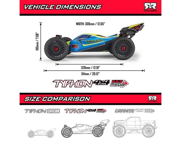 Erlebe Bashing auf einem neuen Level im Bereich Leistung, Fahreigenschaften und Robustheit - mit dem ready-to-run ARRMA TYPHON MEGA 665 4x4 Buggy! Er bietet eine erschwingliche Einstiegsmöglichkeit in die Welt der 1/8 Offroad-Action. Mit dem TYPHON MEGA 665 4x4 erlebst du jetzt besseres Bashing im größeren Maßstab – und kannst später auf Brushless-Antrieb upgraden, um noch mehr Leistung aus dem Fahrzeug herauszuholen.