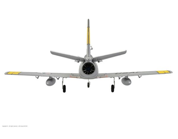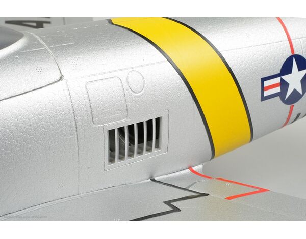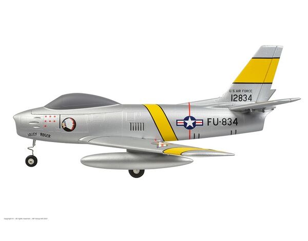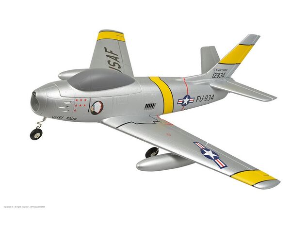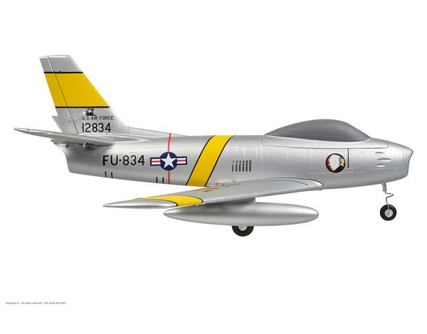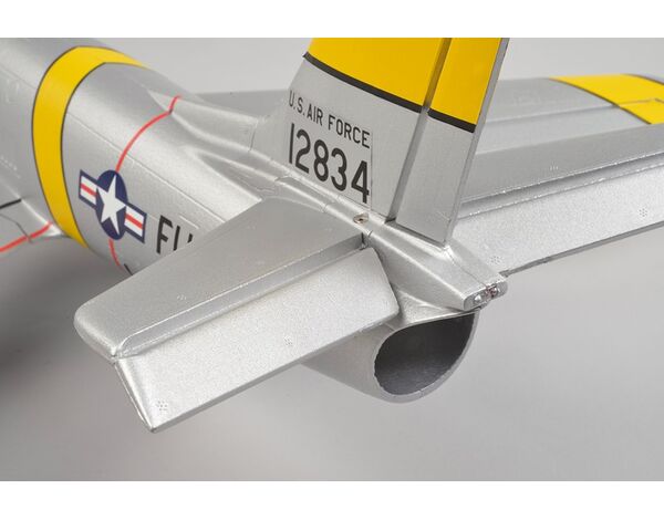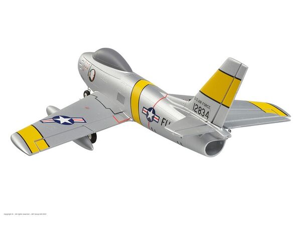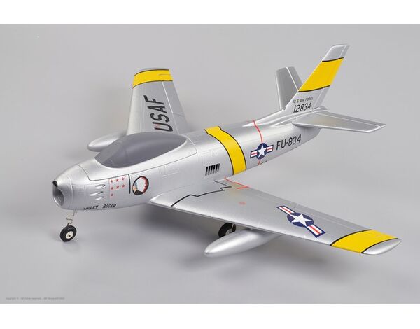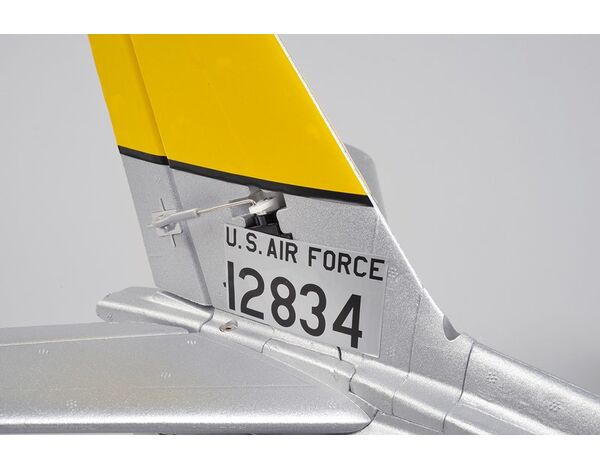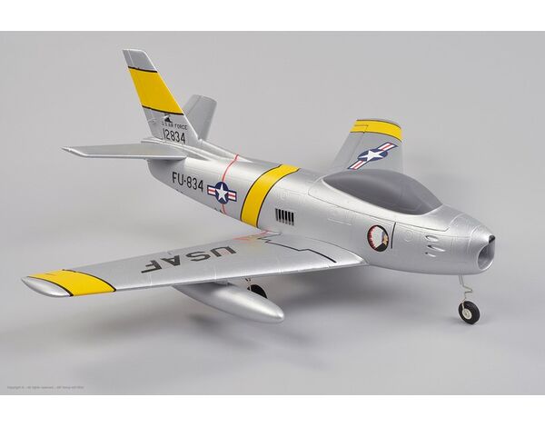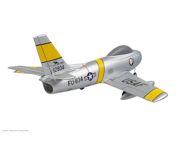 Die F-86 ist aus strapazierfähigem EPO-Schaumstoff gefertigt und verfügt über präzise Konturen und Oberflächenmarkierungen, die für ein akkurates und realistisches Aussehen sorgen. Kohlefaserrohre verstärken die Zelle und sorgen für außergewöhnliche Steifigkeit auch bei aggressiven Flugmanövern. Das Schnellabwurf-Fahrwerk ermöglicht manuelle Starts und sanfte Bauchlandungen auf Grasflächen. Die auffällige Bemalung des Flugzeugs wurde mit einer speziellen Farbe auf Wasserbasis behandelt, die einen metallischen Kaltlichteffekt erzeugt, der hell leuchtet.