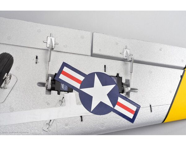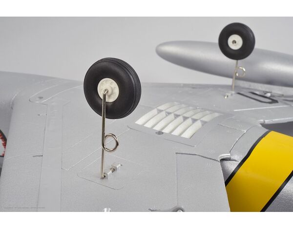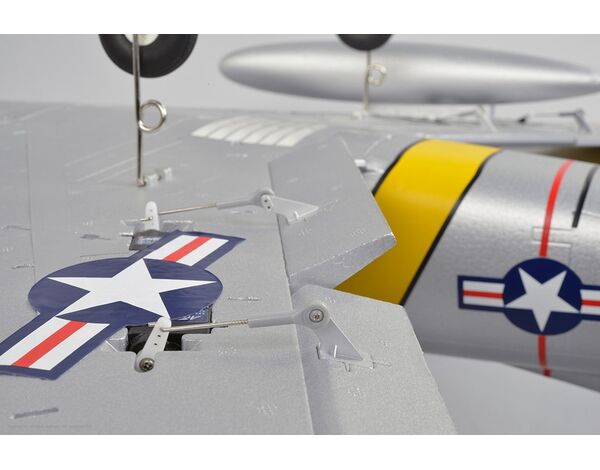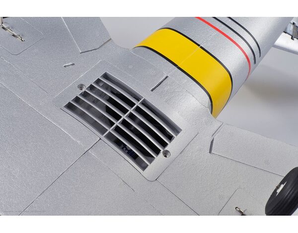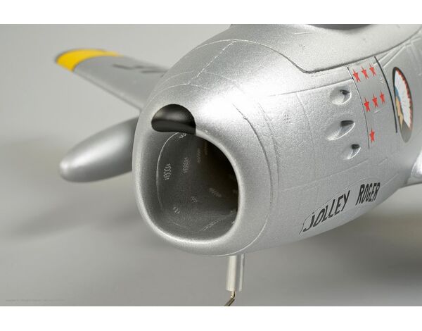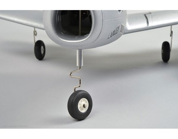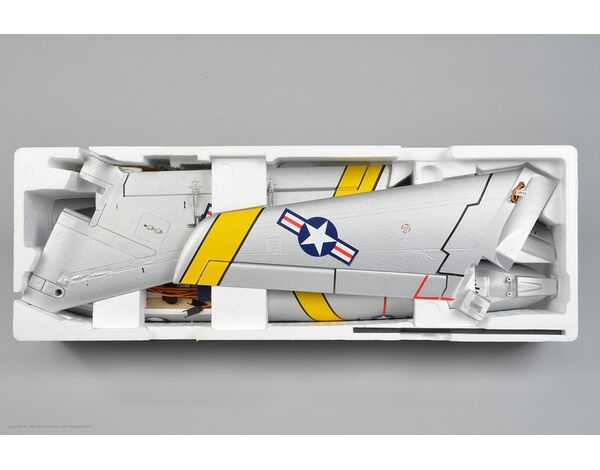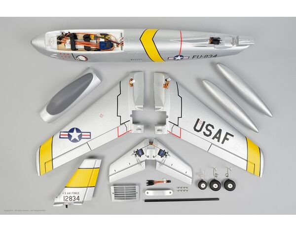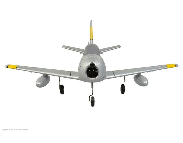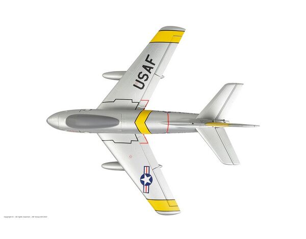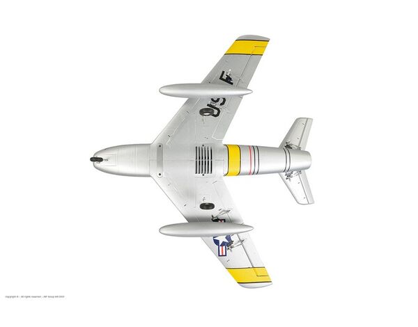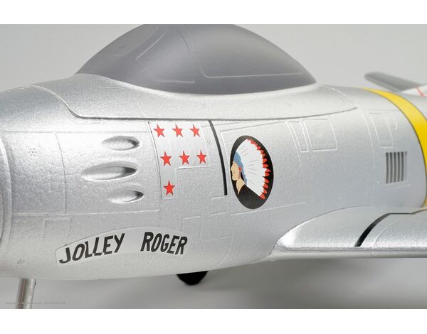 Die F-86 ist aus strapazierfähigem EPO-Schaumstoff gefertigt und verfügt über präzise Konturen und Oberflächenmarkierungen, die für ein akkurates und realistisches Aussehen sorgen. Kohlefaserrohre verstärken die Zelle und sorgen für außergewöhnliche Steifigkeit auch bei aggressiven Flugmanövern. Das Schnellabwurf-Fahrwerk ermöglicht manuelle Starts und sanfte Bauchlandungen auf Grasflächen. Die auffällige Bemalung des Flugzeugs wurde mit einer speziellen Farbe auf Wasserbasis behandelt, die einen metallischen Kaltlichteffekt erzeugt, der hell leuchtet.
