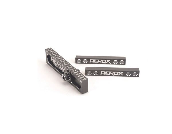 AX013 Aerox TC Droop Gauge Set Introducing the new Aerox droop gauge set for 1-10th Touring cars. A new universal way to take the confusion out of measuring droop across different chassis manufacturers. Droop is a measurement used to define the point at which the tyre leaves contact with the ground. It can be a very powerful tool to quickly change the behaviour of a car. Measuring droop to the axle centre is the most accurate way of doing so, as it eliminates any potential discrepancy in the symmetry of suspension components. This method is also the only correct way to quickly and easily compare droop across different cars, without the need to account for any differences in car design. Using the Aerox system is simple. Fasten the droop wheels on to one pair of axles. The chassis sits on the 10mm droop blocks. The droop gauge is used to measure to the lowest part of the droop wheel. The reading from the gauge is the distance from chassis underside to the centre of axle. Repeat for t