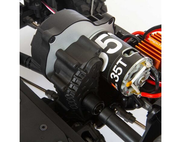 Ausgestattet mit einem leistungsstarken Single-Speed-Getriebe hat der SCX10™ III Base Camp 4WD einen niedrigen Schwerpunkt für Stabilität auf Strecken und Trails. Das Getriebe umfasst auch einen vollständigen Satz Kugellager und Ganzmetall-Zahnräder für Stabilität und Haltbarkeit. Die interne Verzahnung kann so umgestellt werden, dass die Verwendung unseres optionalen Standard Axle Conversion Kits (AXI238000) möglich ist.