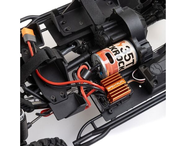 Das mitgelieferte und installierte Antriebssystem umfasst einen Axial Slickrock 35T-Bürstenmotor und einen wasserdichten Spektrum 40A-Brushed-ESC. Mit dieser einfachen und zuverlässigen Kombination verbringst du mehr Zeit auf den Trails und weniger Zeit mit Wartungsarbeiten.