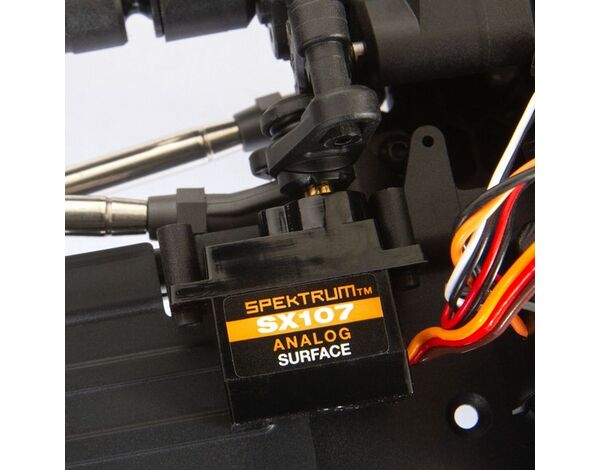 Die mitgelieferte Spektrum ™ DX3 ™ - Fernsteuerung verfügt über die exklusive DSMR®-Technologie für überlegene Reichweite, Reaktion und Störfestigkeit. Es ist auch voll kompatibel mit dem Smart-Telemetrie-Potenzial, das der im Fahrzeug installierte Spektrum ™ Firma ™ Smart 40A ESC / Empfänger bietet.