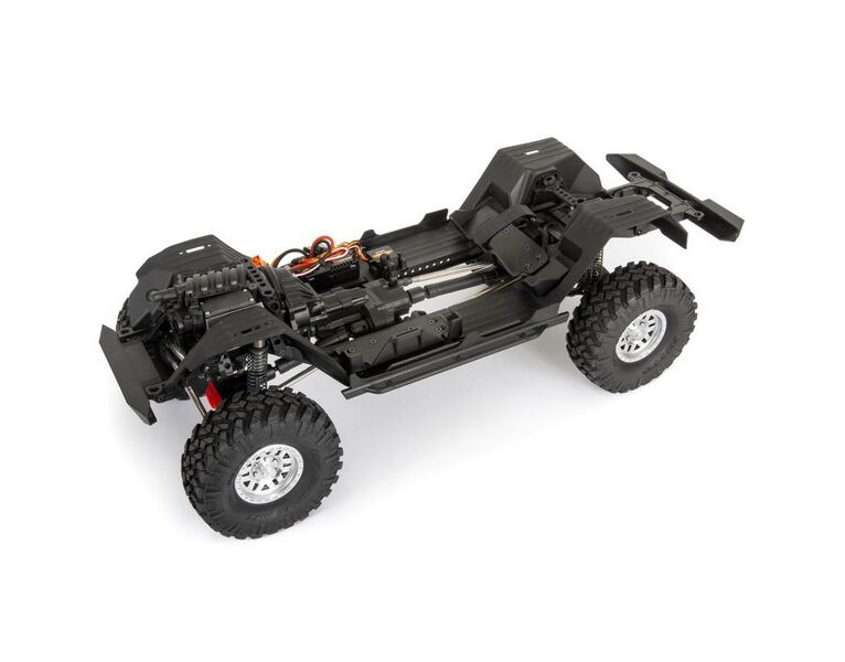 Der SCX10 ™ III Jeep® JT Gladiator verwendet neue AR45 ™ -Portalachsen, um die Leistung zu verbessern, indem die Bodenfreiheit erhöht und die Drehmomentverwinding verringert wird. Der Motor befindet sich an der Vorderseite des Chassis für höhere Frontlastigkeit. Das Standard-Akkufach befindet sich in der Nähe der Fahrzeugmitte, um die Balance zu verbessern, und nimmt LiPo- oder NiMH-Packs in voller Größe auf. Es gibt auch Stellen in den Seitenkästen für Fahrer, die kleinere „Shorty“ -LiPo-Packs bevorzugen. Kotflügel und Seitenteile verbergen interne Komponenten, die normalerweise von der Seite des Chassis aus sichtbar sind.