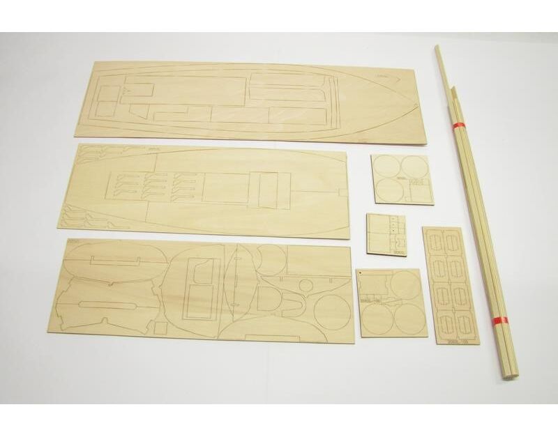 Der Bausatz enthält dem tiefgezogenen ABS-Kunststoffrumpf sowie detaillierte Attrappe einer Dampfmaschine mit stehendem Kessel. Alle Holzteile sind mit Laser präzise ausgeschnitten sowie alle zum Aufbau benötigten Holz-, Kunststoff- und Beschlagteile sind im Lieferumfang enthalten.