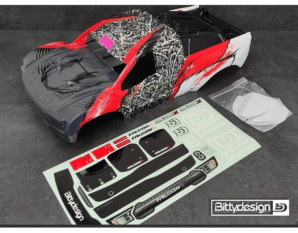 Die Bittydesign FALCON-X ist eine vor lackierte und vorgeschnittene Karosserie, die speziell für den 1/7 ARRMA MOJAVE 6S BLX entwickelt wurde. Hergestellt aus hochwertigem 1,5 mm starkem Lexan®-Polycarbonat, bietet sie eine außergewöhnliche Haltbarkeit sowie ein einzigartiges Design, das dein Modell von der Masse abhebt.
