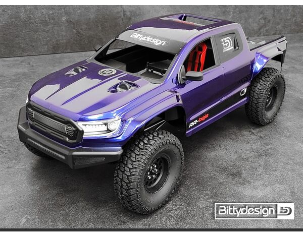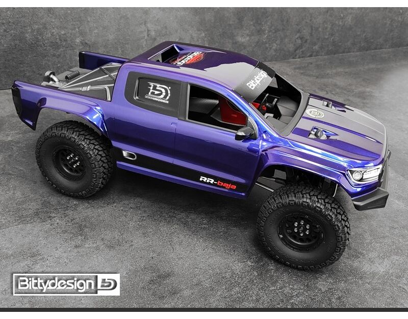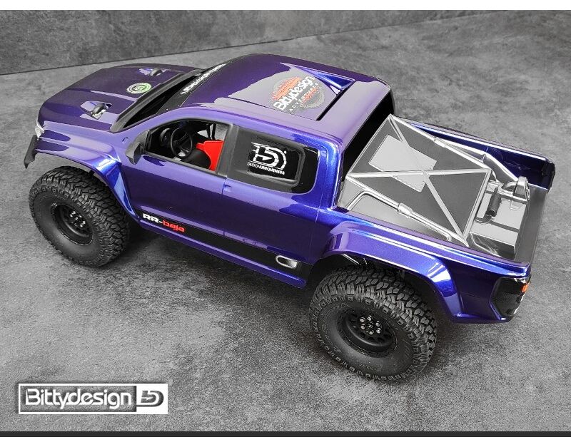 Die RR-Baja Karosserie von Bittydesign setzt neue Maßstäbe in der Welt der Rock Crawler. Anders als die typischen Vintage-Designs basiert diese Karosserie auf einem modernen Pickup-Konzept, das mit rennsporttypischen Details konsequent weitergedacht wurde: Breite Kotflügel, angedeutete Twin-Turbolader auf der Haube und ein funktional gestaltetes Race-Bett im Baja-Stil machen diese Karosserie zu einem echten Hingucker auf jedem Trail.