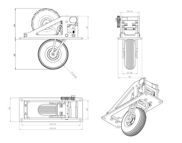Modernes elektrisches Einziehfahrwerk mit montiertem Stellmotor und sehr kräftigem Getriebe.