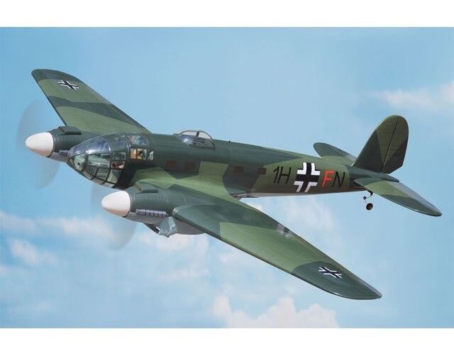 Originalgetreue Nachbildung des zweimotorigen Tiefdeckers der Ernst Heinkel Werke in Rostock. Die Maschine wurde in den 30er Jahren als schnelles Verkehrsflugzeug für die Lufthansa eingesetzt und konnte 10 Passagiere befördern. Im zweiten Weltkrieg wurde die HE 111 häufig als Bomber eingesetzt. Das Modell wurde für Elektroantrieb entwickelt, kann wahlweise aber auch mit zwei Verbrennungsmotoren ausgestattet werden.