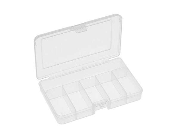Very handy and useful box for parts storage. Tough, durable, translucent plastic box with pre-set compartments. Easy, quick-access storage for small parts.