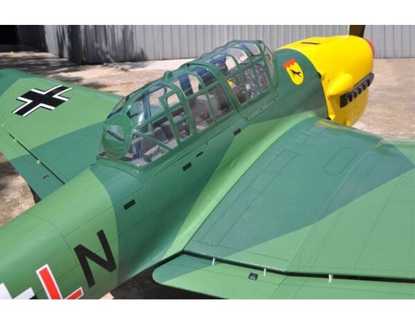 C9119 BlackHorse Junkers JU 87 Stuka / 2300mm Die Junkers Ju 87 Stuka war im Original ein einmotoriges WW2 Kampfflugzeug aus deutscher Produktion. Der Name Stuka ist eine Abkürzung für Sturzkampflugzeug. Der von der Junkers Flugzeugwerk AG entwickelte Tiefdecker mit Knickflügeln, starrem Fahrgestell wurde von der deutschen Luftwaffe und den Luftstreitkräften verbündeter Länder eingesetzt. Bei der Modellumsetzung wurde auf ein möglichst originalgetreues Aussehen geachtet sowie auf beste Flugeigenschaften. Das Modell wurde für Elektroantriebe konstruiert, kann aber auch mit einem Verbrennungsmotor ca. 50cc Hubraum betrieben werden. Produktmerkmale * ARF Fertigmodell in perfekter Holzbauweise (Lasercut) * Fertig bespannt wie abgebildet * Höchster Vorfertigungsgrad * Tragflächen 2-teilig mit Alurohrsteckung * Lackierte GFK Motorhaube * Spinner Ø 115mm * Fertig ausgebautes Scale-Cockpit * Handbemalte Pilotenpuppe * Räder, Anlenkungen, Kleinteile, bebilderte Anleitung Technis