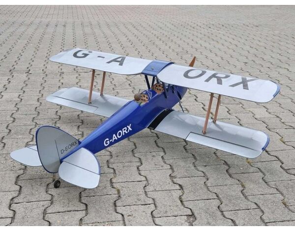 Die de Havilland D.H.82 Tiger Moth ist ein einmotoriges Doppeldecker-Schulflugzeug, das 1931 seinen Erstflug hatte. Entworfen hat dieses Flugzeug Geoffrey de Havilland. Dabei wurde die Tiger Moth als Schulflugzeug bei der britischen Royal Air Force eingesetzt. Gegen Ende der Einsatzzeit um das Jahr 1950 wurden viele D.H.82 zivil genutzt. Viele davon fliegen noch heute auf Veteranentreffen. Das Modell wurde dem Original liebevoll nachempfunden und weist sehr gutmütige Flugeigenschaften auf. Unsere Tiger Moth wurde von Grund auf für Elektroantriebe entwickelt. Das große, nach oben abnehmbare Cockpit erlaubt einfache Akkuwechsel und Wartungsarbeiten. Aufgrund der kompakten Größe kann das Modell zusammengebaut in den meisten PKWs transportiert werden, ohne die Tragflächen abzubauen.