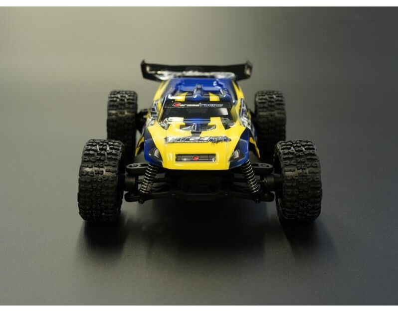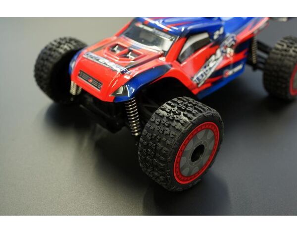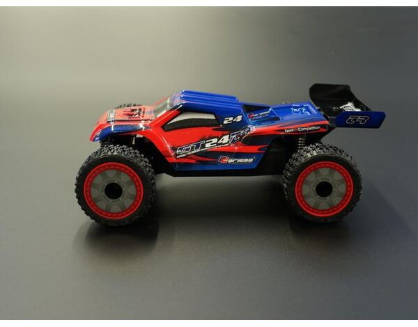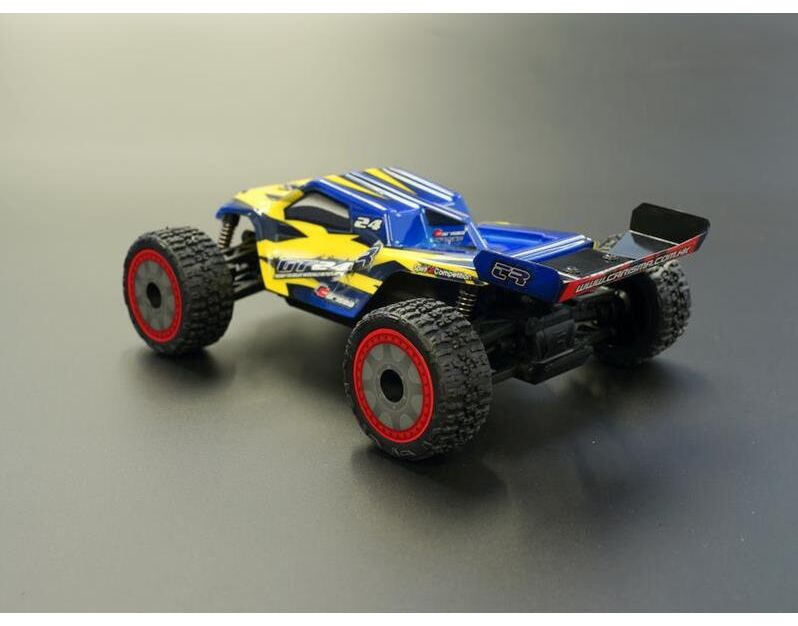 This car comes with a Red/Blue or Yellow/Blue colour scheme, in addition to a 2.4GHz radio setup, including a new CTX8000 transmitter. The servo is very fast and the car comes with full ball bearings and plastic gear differentials. The GT24TR comes ready-to-run with a 130mAh 7.2V NiMh battery and USB charger. You will also receive a small phillips head screwdriver, spare pinion gears and spur gears and four AA batteries for the transmitter. This is one fun-filled RC car.