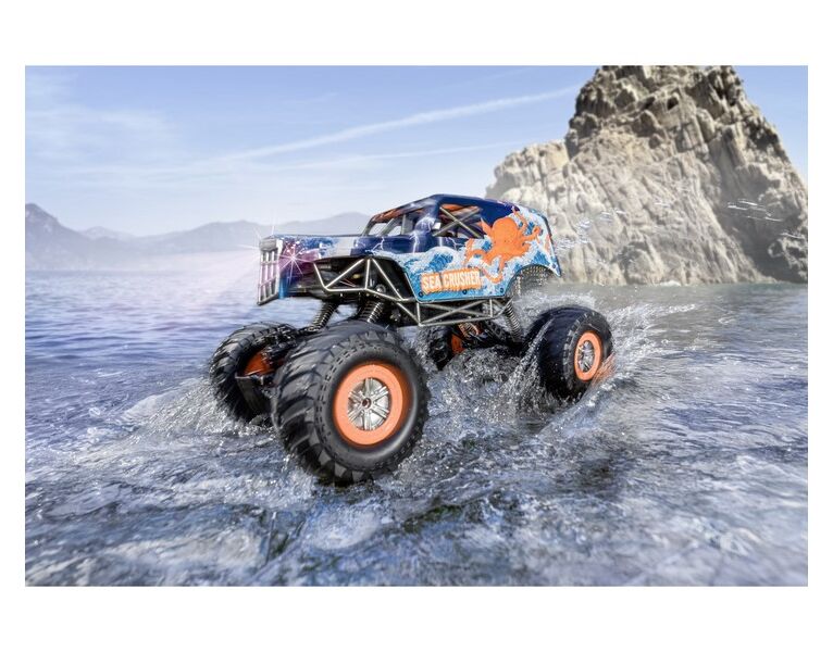 Im Gelände und zu Wasser: Mit dem Sea Crusher ist nicht nur das Fahren im Gelände, sondern auch das Fahren und Schwimmen auf und im Wasser möglich! Der 4-Radantrieb, die Vollfederung und die extrem verschränkbaren Radachsen machen das Fahrzeug zu einem wahren Multitalent. Für perfekte Ausleuchtung im Dunkeln sorgt die LED-Beleuchtung an der Front. Mit einer Ladezeit von knapp 4 Stunden lässt der LiIon Akku eine ansehnliche Betriebsdauer von 20 Minuten unter Volllast zu. Dem Fahrzeug liegen eine 2.4 GHz Fernsteueranlage, ein 7.4 V/1.200 mAh LiIon-Akku, ein USB-Ladegerät, 3x AA Senderbatterien, sowie eine ausführliche Anleitung bei.
