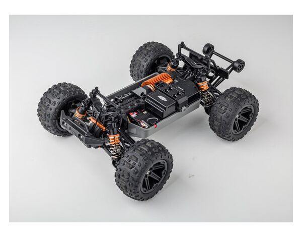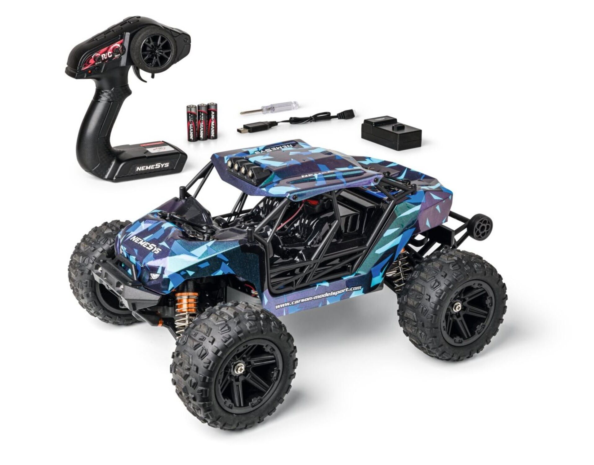 Ein viel zu frecher Flitzer den man gerne unterschätzt. Mit seinem 7.4 V Lilon-Akku mit 1300 mAh und seinem Vierradantrieb bringt das Fahrzeug eine ordentliche Kraft auf die Achsen und ist außerdem extrem geländefähig. Die einstellbaren Stoßdämpfer sowie die griffigen Reifen mit Profil lassen den Nemesys selbst durch schweres Gelände gleiten wie einen Wüstenadler. Die Komponenten des RC-Fahrzeugs sind spritzwassergeschützt und lassen Regen und Staub keine Chance! Bei vollem Einsatz bei bis zu 35 Km/h Vmax sorgen ganze 30 Minuten Fahrzeit für eine beeindruckende Statistik. Durch die mitgelieferten Batterien und Akku ist der NemeSys sofort fahrbereit.