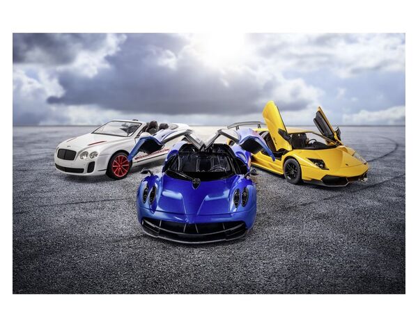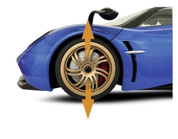 Ein herrlicher Exot für hitzige Stunden: Der Pagani Huaira ist ein besonders ausgefallenes Modell im Maßstab 1:14. Durch die griffigen Reifen, der Vollfederung und dem Differenzial Getriebe liegt der majestätische Sportwagen optimal auf der Straße. Ein 2.4 GHz Fernsteuersystem gibt dabei die absolute Kontrolle über das Fahrverhalten. Die LED-Beleuchtung sorgt sowohl an der Front als auch am Heck für die perfekte Inszenierung. Die Türen des Pagani können geöffnet werden. Dem Fahrzeug liegen neben dem 7.4 V/500 mAh LiIon Akku und der Fernbedienung auch ein USB-Ladegerät, 2x Senderbatterien LR06/AA und eine ausführliche Anleitung bei.