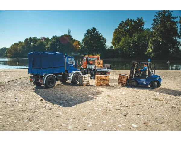 Fahrfertig aufgebauter Gabelstapler, 6-Kanal 2,4 GHz Fernsteueranlage mit Tragegurt, Fahrerfigur, Palette mit Ladegut, Senderbatterien