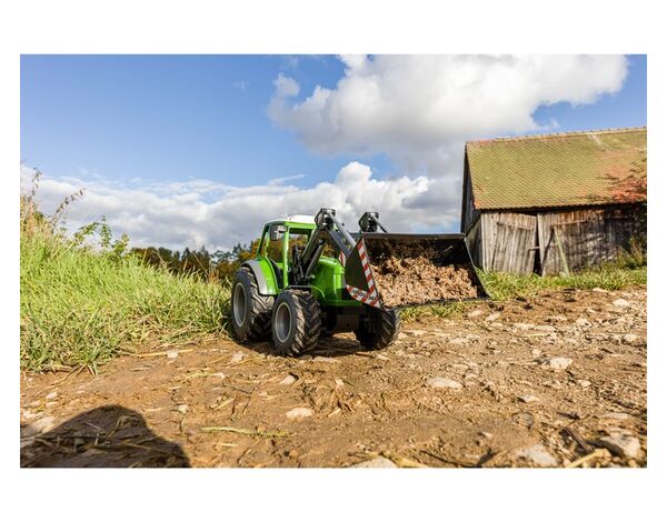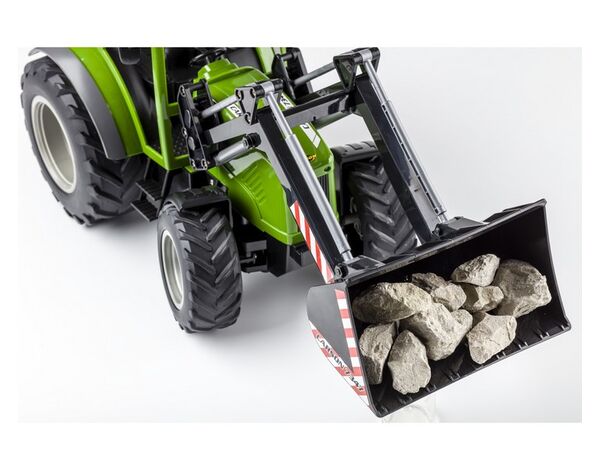 Traktor mit der Funktion eines Radladers! Der Frontlader fährt in unwegsamen Gelände und ist dafür ausgestattet mit griffigen Gummireifen im originalgetreuen Profil. Das Landwirtschaftsfahrzeug im Maßstab 1:16 beinhaltet viele Details mit neuester Technik wie die störungsfreie 2,4 GHz Mehrkanalfernsteuerung, Sound und Licht, Motorengeräusche. Mit der Fernsteueranlage werden Funktionen wie Licht, Hupe und Motorensound gesteuert. Der Frontlader kann Lasten bis zu 200g heben und senken. Über den Sender lässt sich außerdem die Schaufel heben und senken. Der eingebaute Li-Ion Fahrakku ermöglicht eine Fahrzeit von bis zu 50 Minuten.