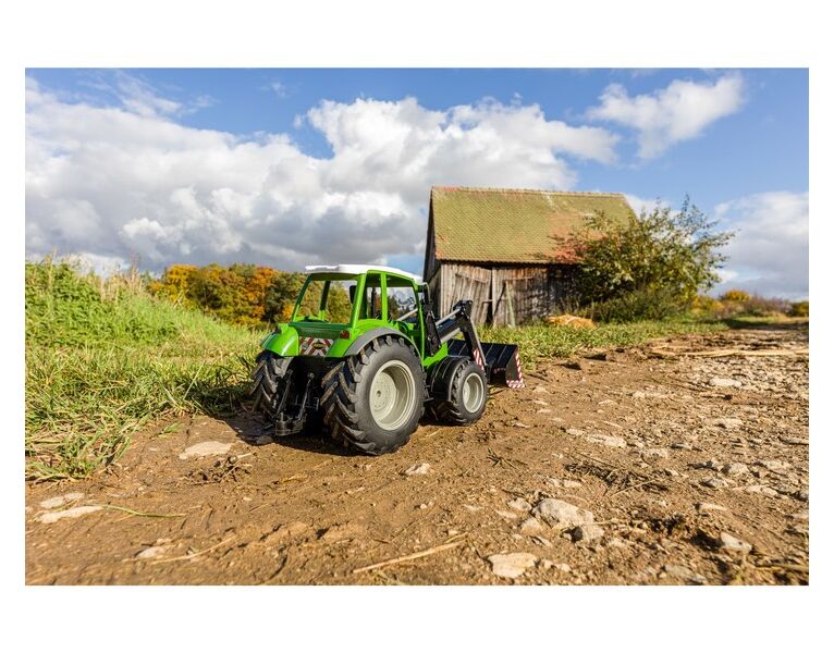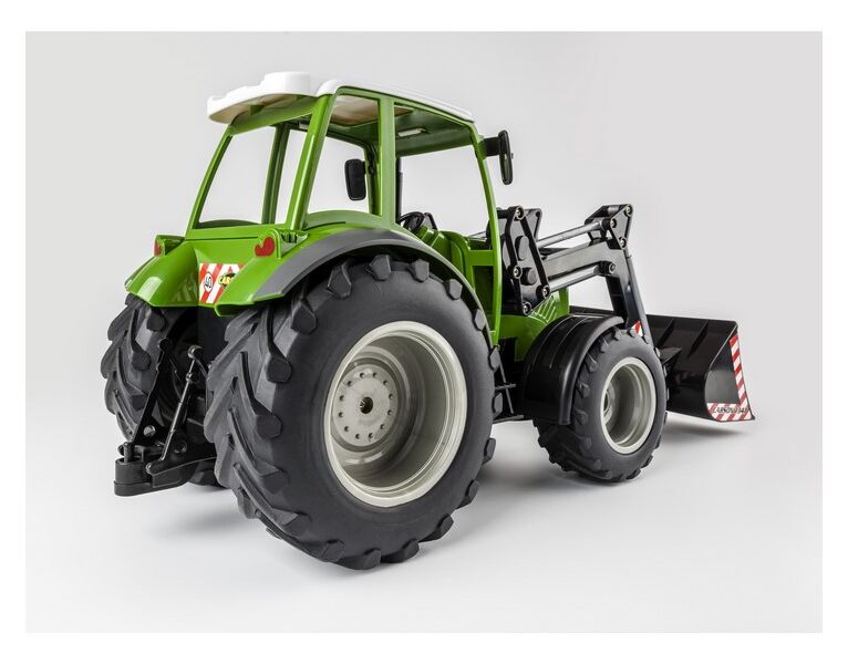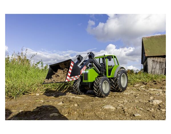 Traktor mit der Funktion eines Radladers! Der Frontlader fährt in unwegsamen Gelände und ist dafür ausgestattet mit griffigen Gummireifen im originalgetreuen Profil. Das Landwirtschaftsfahrzeug im Maßstab 1:16 beinhaltet viele Details mit neuester Technik wie die störungsfreie 2,4 GHz Mehrkanalfernsteuerung, Sound und Licht, Motorengeräusche. Mit der Fernsteueranlage werden Funktionen wie Licht, Hupe und Motorensound gesteuert. Der Frontlader kann Lasten bis zu 200g heben und senken. Über den Sender lässt sich außerdem die Schaufel heben und senken. Der eingebaute Li-Ion Fahrakku ermöglicht eine Fahrzeit von bis zu 50 Minuten.