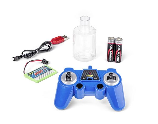 Fahrfertiges Modell, 2,4GHz Fernsteueranlage, Li-Ion Fahrakku 3.7V / 600 mAh, USB-Ladegerät, 2 x AA Senderbatterien, Tankflasche.