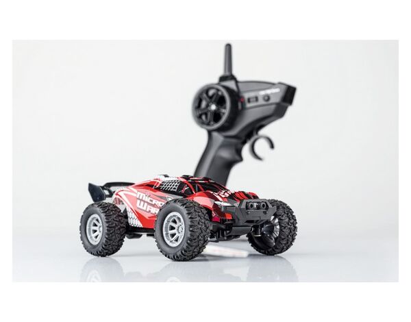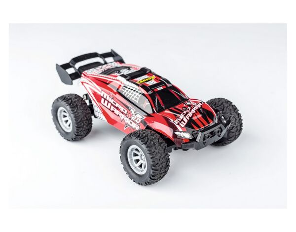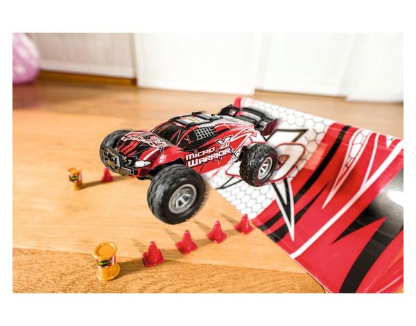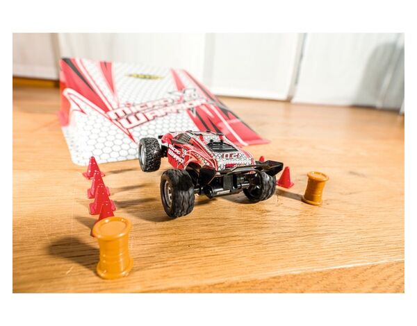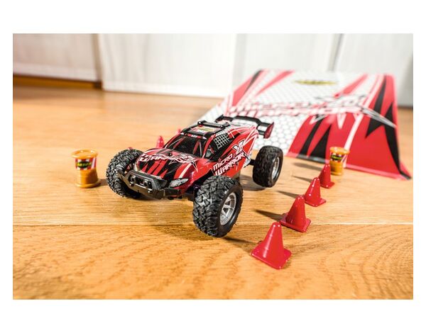Der Micro X-Warrior 2.0 im Maßstab 1:32 ist die perfekte Mini-Rennmaschine für Haus und Garten. Der einfach zu steuernde 2WD RC-Buggy verfügt über zwei Geschwindigkeitsstufen bis 30 km/h und ist extrem wendig. Dank der griffigen Gummireifen hast du auch auf unebenen Untergründen immer genug Grip. Zum Lieferumfang gehören neben der optisch zum Fahrzeug passenden Sprungschanze eine 2,4 GHz 3-Kanalfernsteuerung, ein LiPo-Fahrakku, Werkzeug und mehrere Pylonen zum Aufbau einer Rennstrecke. Nach einer langen Fahrzeit von 15 min kannst du den kleinen Flitzer ganz bequem per USB-Kabel wieder aufladen. Kaufen – Laden – Fahren!