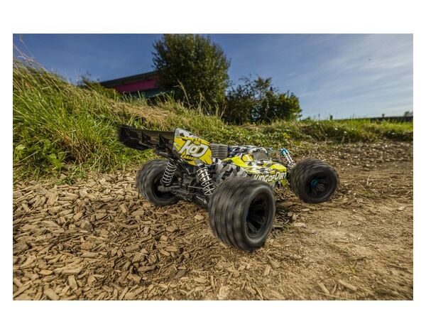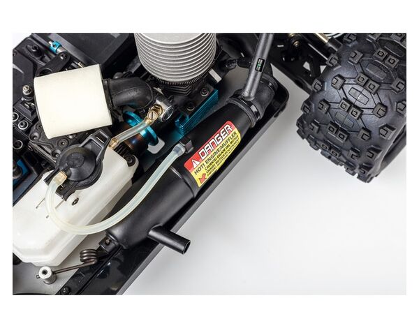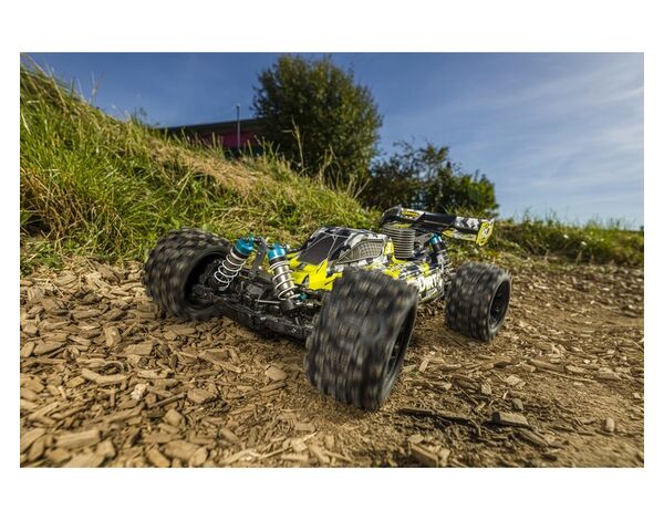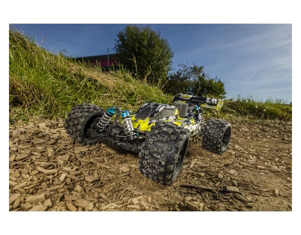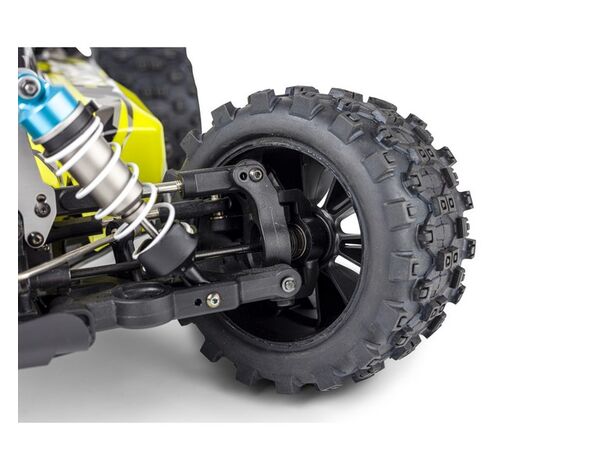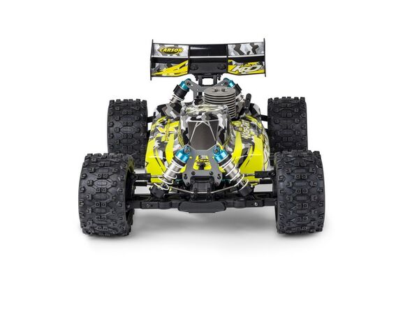 Du willst kompromisslose Nitro-Action? Dann ist der CARSON 1:8 King of Dirt Buggy V25 GP wie gemacht für dich! Mit seinem extra schmalen 3 mm Alu-Chassis, dem 4,1 ccm Force-Nitro-Motor und seinen 3 Stahl-Differenzialen ist der Allrad-Buggy im Gelände ein echtes Brett. Dank wasserdichter RC-Komponenten macht er auch auf verschlammten Offroad-Pisten alles mit. Dabei beschleunigt der 4,1 ccm Force Nitro-Motor den knapp 3,5 kg schweren Buggy auf bis zu 70 km/h. Der tiefe Schwerpunkt und zahlreiche Setup-Optionen sorgen für perfekte Bodenhaftung und lassen den CARSON King of Dirt über alle Strecken brettern. Der Nitro-Buggy ist komplett kugelgelagert und verfügt über eine gehärtete Kupplung aus massivem Stahl. Ausgeliefert wird der King of Dirt mit einem störungsfreien 2.4 GHz Fernsteuerungssystem. Bereit für die Action? Kaufen – Laden – Action!