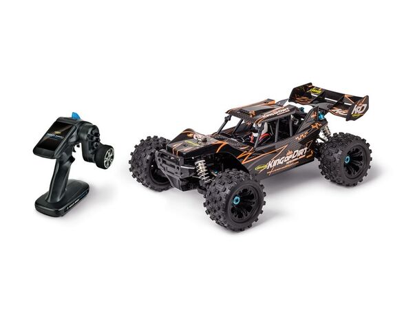 Extra schmales 3 mm Alu-Chassis, 100 A HOBBYWING Brushless-Set 4S, Alu- Öldruckstoßdämpfer und ein 9k Lenkservo mit Metallgetriebe: Der King of Dirt mit der aufklappbaren Pickup-Karo ist im Gelände ein echtes Monster. Dank wasserdichter RC-Komponenten macht er selbst auf verschlammten Offroad-Pisten alles mit. Das kraftvolle HOBBYWING Brushless-Set beschleunigt den knapp 3,5 kg schweren Pickup auf bis zu 80 km/h. Zahlreiche Setup-Optionen sorgen für perfekte Bodenhaftung. Ausgeliefert wird der King of Dirt Pickup mit einem störungsfreien 2.4 GHz Fernsteuerungssystem inklusive Failsafe.
