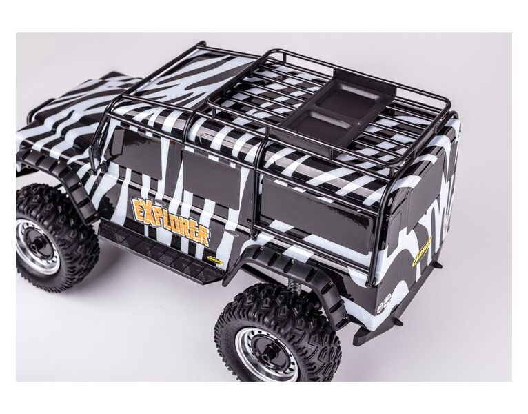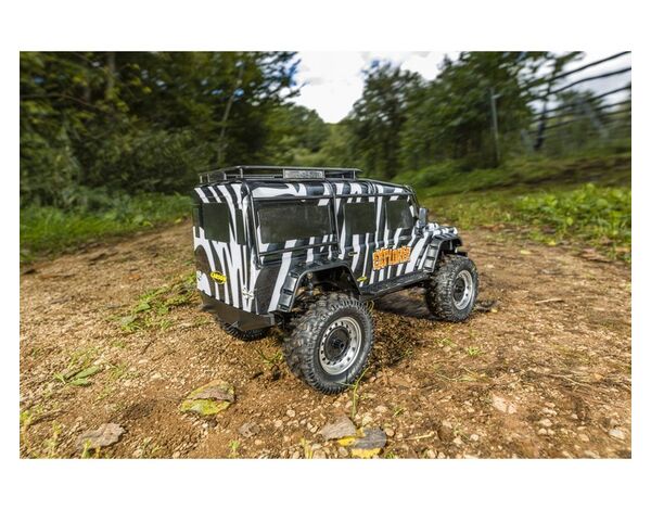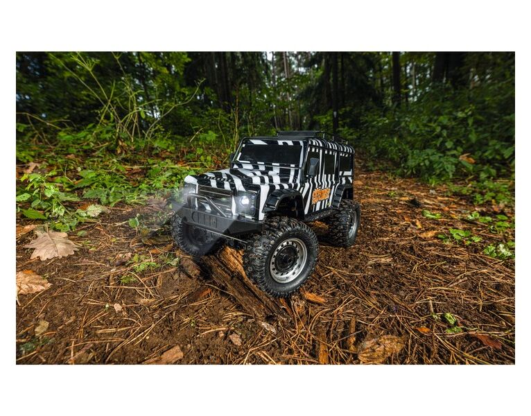 Du willst auf RC-Safari im Gelände? Der CARSON Land Rover Defender mit Zebra-Lackierung ist der Jeep deiner Wahl! Mit seiner schlagfesten und robusten Karosserie ist der Offroad-Klassiker perfekt geeignet für ausgedehnte Geländetouren. Der ferngesteuerte Crawler ist voll gefedert und mit extrem verschränkbaren Radachsen versehen. Angetrieben wird der 20 km/h schnelle 4WD-Geländewagen an Vorder- und Hinterachse. Die vollproportionale Lenkung lässt sich über die im Lieferumfang enthaltene 2,4 GHz Fernsteuerung einstellen. Die Geschwindigkeit kann für besonders anspruchsvolles Gelände gedrosselt werden. Dank der LED-Beleuchtung an der Vorderseite sind auch Fahrten bei Dämmerung kein Problem. Geladen wird der Land Rover via USB, eine Akkuladung bringt dir 20 Minuten Fahrspaß. Viel Vergnügen auf Safari mit deinem CARSON 1:8 Land Rover Defender!