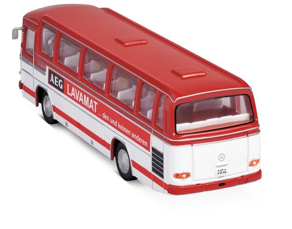 Der O 302 von Mercedes-Benz wurde 1965 vorgestellt, bis 1976 wurden mehr als 32.000 Exemplare gebaut. Eingesetzt wurde der Hochflurbus als echter Allrounder im Stadt-, Überland- und auch im Fernreiseverkehr. Das CARSON-Modell im Maßstab 1:87 verfügt über eine störungsfreie 2.4 GHz Fernsteueranlage, die eine fein abgestimmte Steuerung (digital-proportional) von Gas und Lenkung mit Lenkungstrimmung ermöglicht. Der eingebaute Li-Ion Fahrakku sorgt für eine extra lange Fahrzeit von bis zu 60 Minuten bei nur 30 Minuten Ladezeit. Geladen wird der Mini-Bus über den Power-Plug direkt am Sender. Damit ist der schicke Omnibus stets fahrbereit: auf der Eisenbahnanlage, auf dem Schreibtisch oder auch unterwegs. Die detaillierte Lackierung und die AEG-Lavamat-Bedruckung sowie die funktionierenden Front- und Rückleuchten verleihen dem kleinen Klassiker den letzten Schliff. Das typische Motorengeräusch ist unverkennbar und lässt sich über den Sender ein- und ausschalten. Aufbewahrt werden Fahrzeug und Sender in einer mitgelieferten Vitrine. 4 AAA-Senderbatterien vervollständigen den Lieferumfang zu einem 100 % Komplett-Set. Viel Spaß mit dem Mercedes-Benz O 302 AEG! Kaufen – Laden – Fahren!