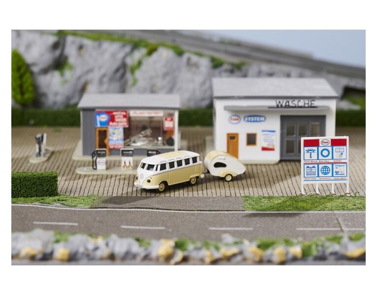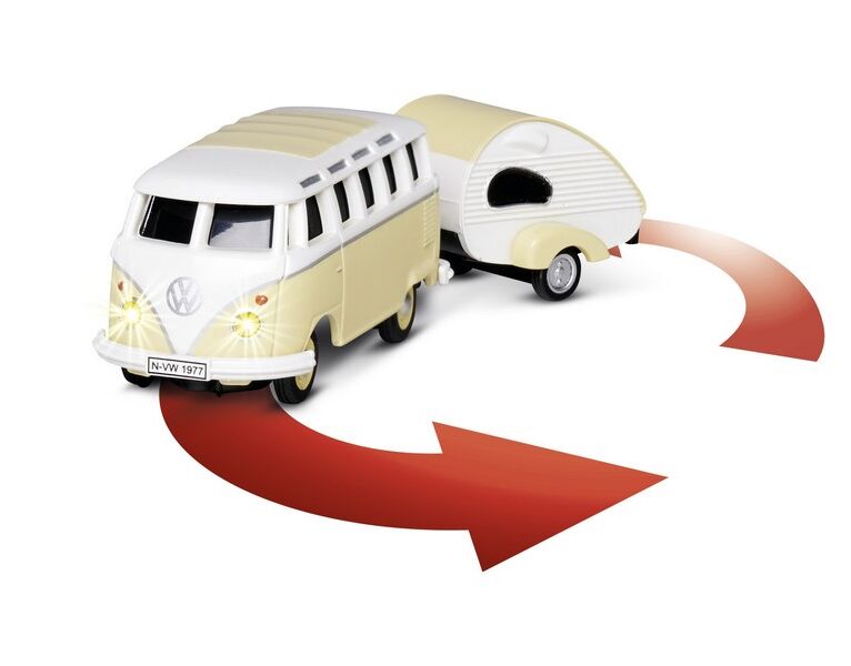 Eintauchen in eine Welt der Nostalgie und Freiheit… Mit unserem brandneuen ferngesteuerten VW T1 SambaBus mit Wohnwagen im Maßstab 1:87 ist dies möglich. Das fahrfertige Modell im Set beinhaltet alles, was Sie brauchen, um sofort loszulegen. Die 2,4 GHz Fernsteuerung mit Ladeanschluss ermöglicht eine einfache Handhabung und schnelle Aufladung und der leistungsstarke 3,7V/75mAh Li-Ion Akku sorgt für langanhaltenden Fahrspaß. Durch sein detailgetreues Design und die nostalgische Artwork wird das T1-Modell zu einem einzigartigen Sammlerstück. Das Set Inklusive Aufbewahrungsvitrine und 4 AAA-Batterien, mit Wohnanhänger, Fernsteuerung und Akku komplettiert das Abenteuer perfekt.