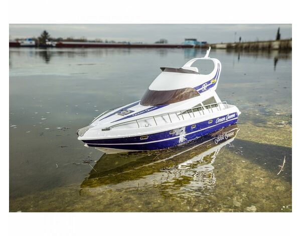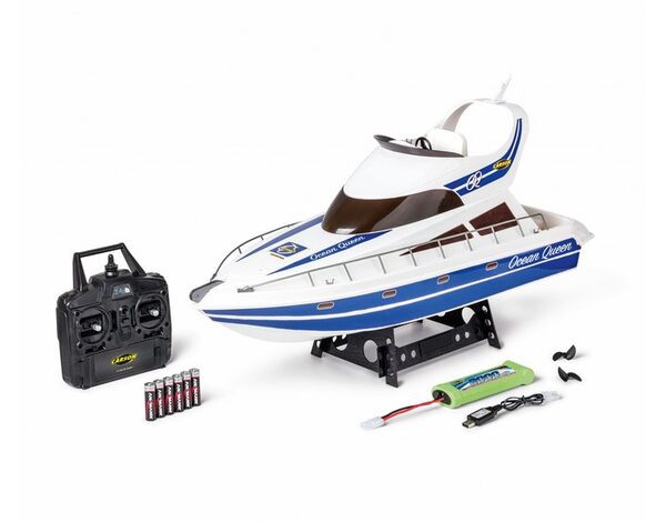 Die CARSON Ocean Queen ist ein ferngesteuertes Traumschiff mit ordentlich Power. Angetrieben wird die 70 cm lange RC-Yacht von zwei kräftigen Brushed-Motoren vom Typ 550 – einer für jede der beiden Schiffsschrauben. Bis zu 30 km/h Spitzengeschwindigkeit sind so möglich! Die Ocean Queen ist direkt nach dem Laden des Fahr-Akkus einsatzbereit. Zum Lieferumfang gehören neben einer 2.4 GHz Fernsteueranlage inklusive Senderbatterien und einem NiMH-Fahrakku mit Ladegerät außerdem zwei Ersatzschiffsschrauben. Der leistungsstarke 2000 mAh Akku garantiert eine Fahrzeit von 20 Minuten. Kurs setzen – und dein Abenteuer kann beginnen!