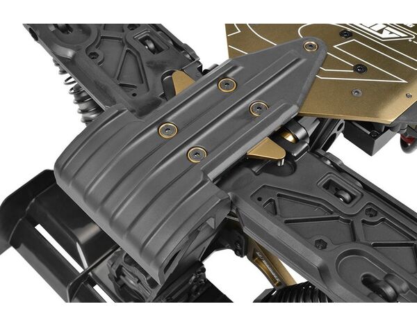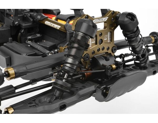 Das Herzstück des Kagama Limited Edition ist sein kompromissloses 7075 Aluminium Rückgrat - eine Grundlage, die für extreme Haltbarkeit und präzises Handling entwickelt wurde. Das goldeloxierte Chassis aus 7075er Aluminium bietet nicht nur unübertroffene Festigkeit, sondern auch einen außergewöhnlichen Stil. Um die Struktur weiter zu verstärken, fixieren CNC-gefräste 7075-Aluminium-Getriebgehäuse den Antriebsstrang, verhindern unerwünschte Bewegungen und sorgen für eine reibungslose, zuverlässige Leistungsabgabe, selbst bei extremer Belastung. Die 6 mm dicken 7075 Aluminium-Stoßdämpferbrücken sorgen in Verbindung mit den neuen Stoßdämpferabstandshaltern für eine felsenfeste Aufhängung, die es den bewährten Kagama-Stoßdämpfern ermöglicht, Stöße gleichmäßig zu absorbieren - egal wie hart Sie den Truck bewegen. Zusätzlich verbessert der 7075 Aluminium Servo Saver Lenkhebel die Lenkpräzision und Haltbarkeit und sorgt für ein direktes und reaktionsschnelles Handling unter allen Fahrbedingungen.